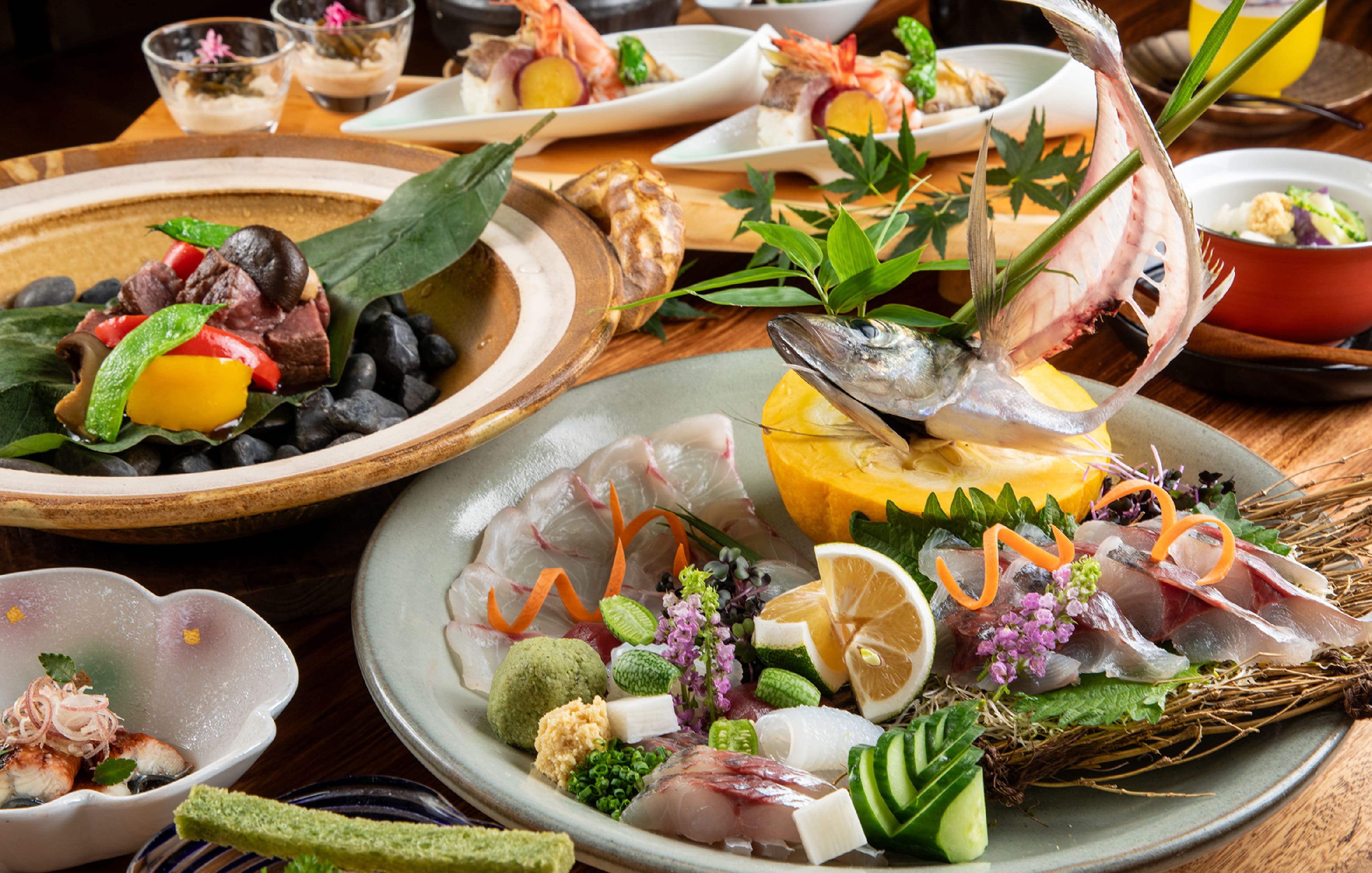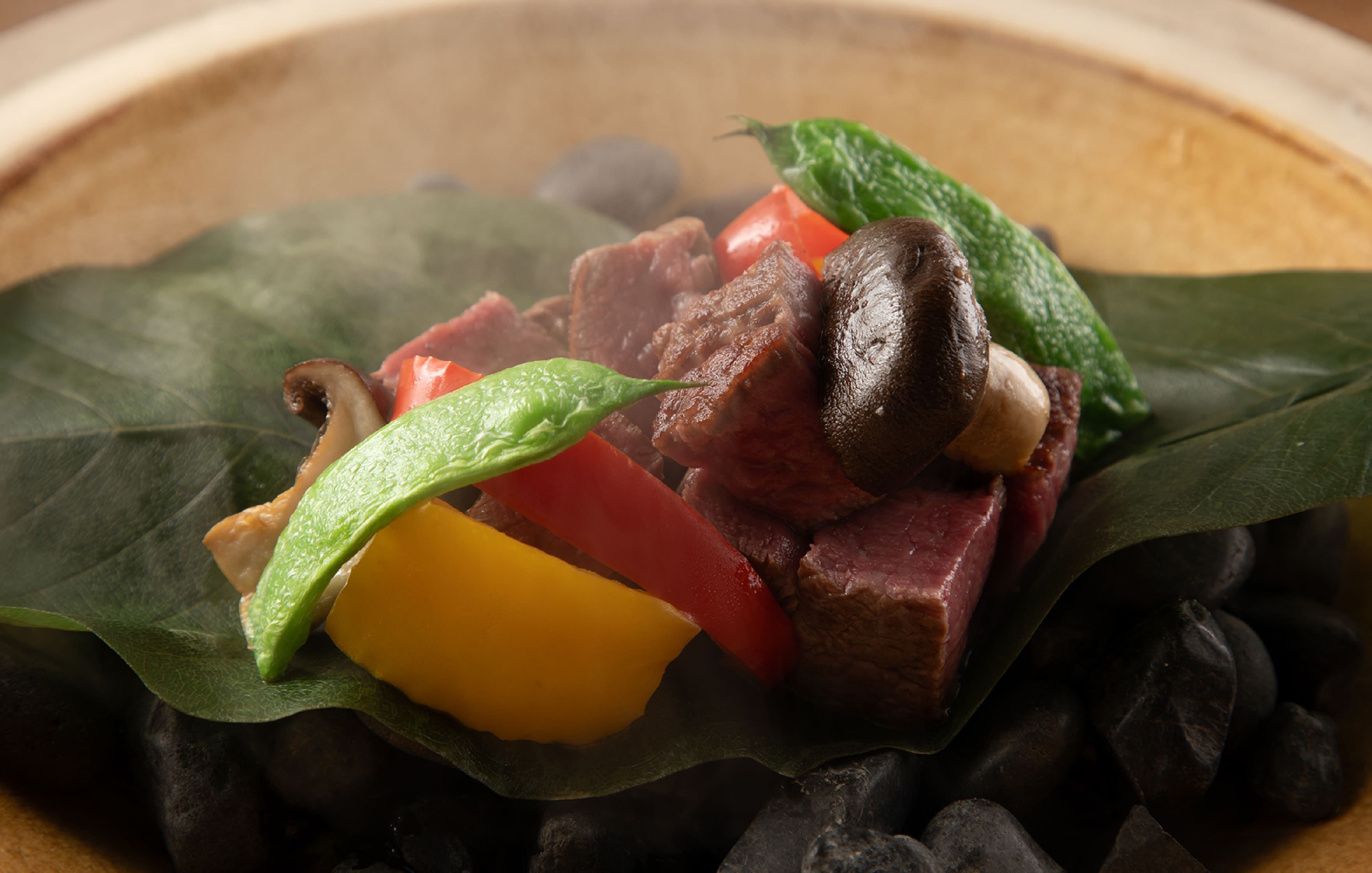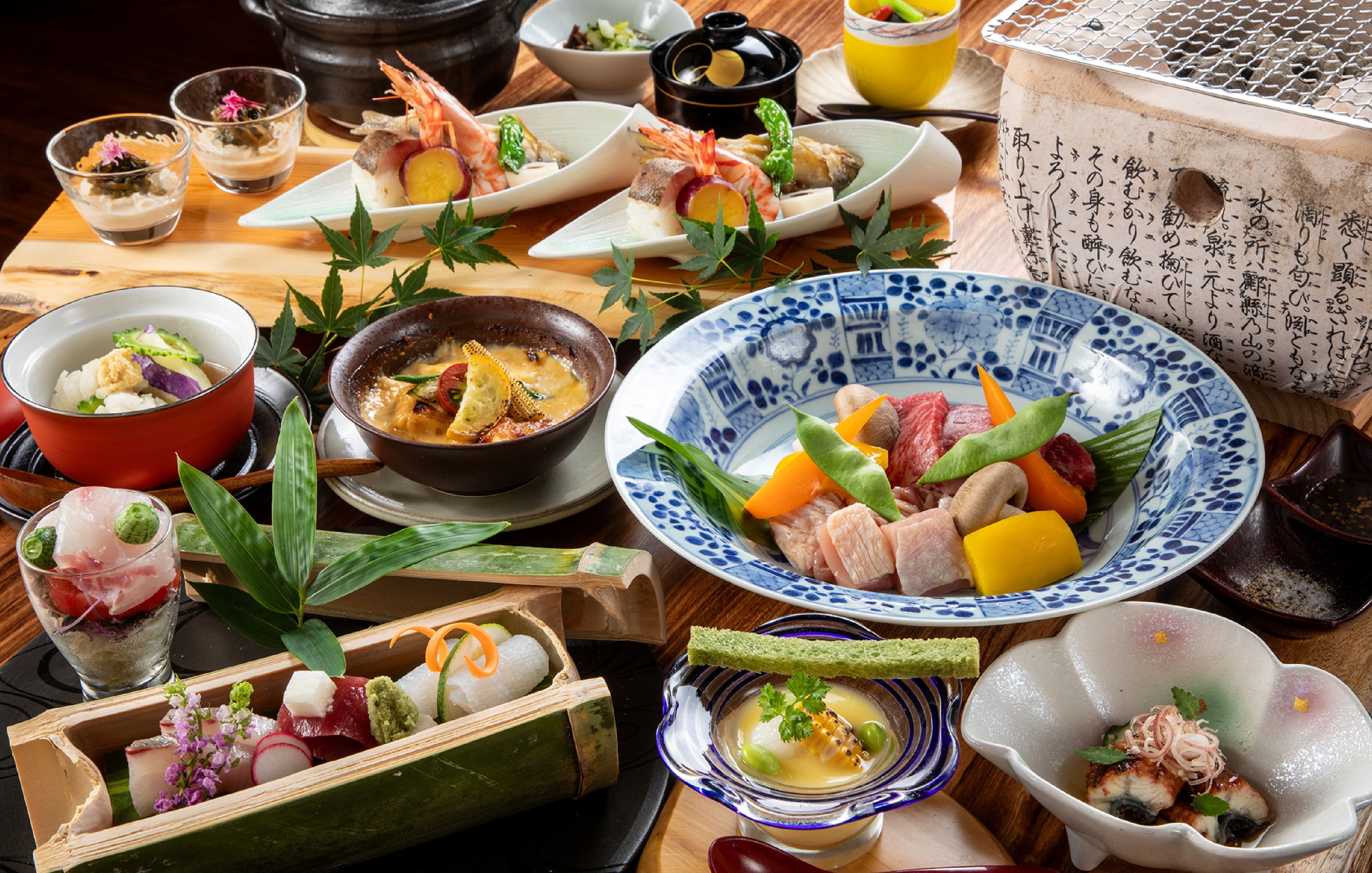 현지의 제철 특산물이 자아내는 창작 카이세키오이타 와규 소고기의 후박나뭇잎구이와 숯불구이,
