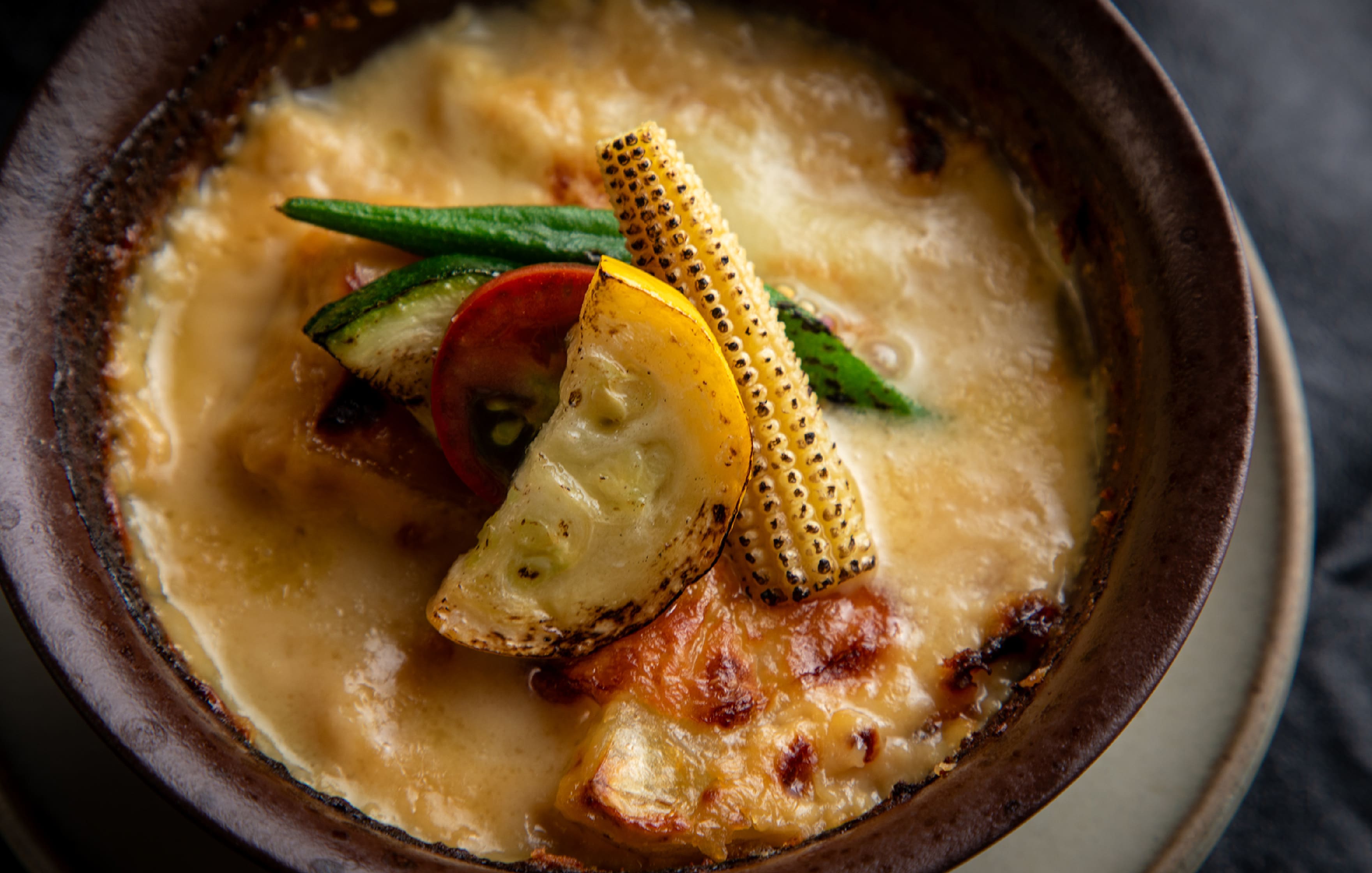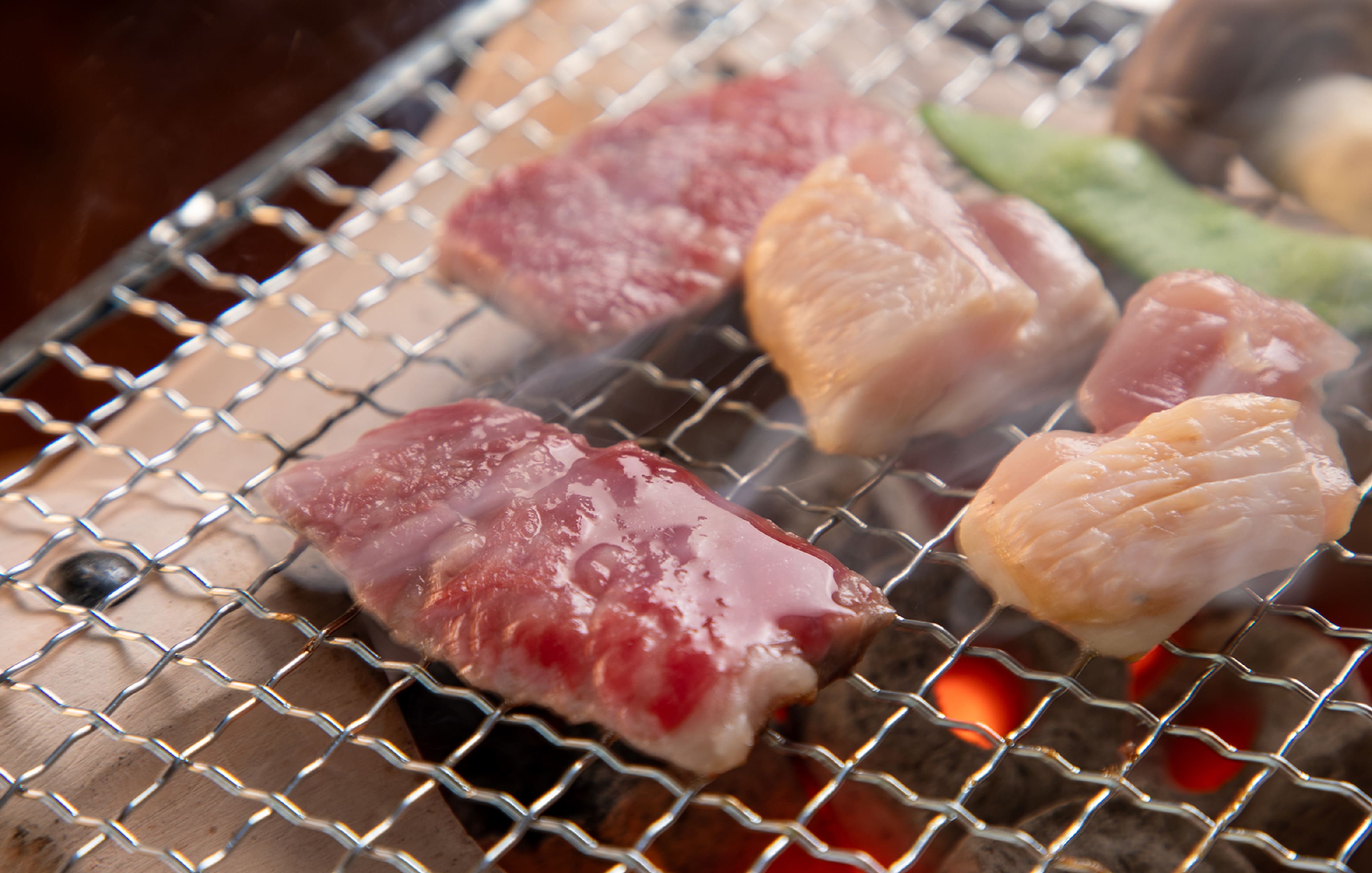 레스토랑한정, 숯불향 감도는 최상의 행복한 시간. 오이타 와규 소고기와 토종닭, 제철의 현지식재가 듬뿍. 오이타의 풍부한 맛을, 숯불구이의 향긋한 풍미와 함께 즐기세요.